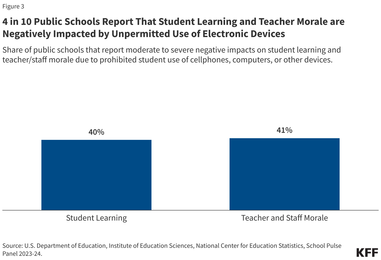 3Share of public schools that report moderate to severe negative impacts on student learning and teacher/staff morale due to prohibited student use of cellphones, computers, or other devices.