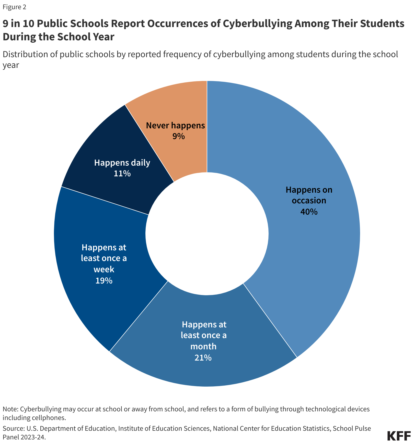 Cyberbullying may occur at school or away from school, and refers to a form of bullying through technological devices including cellphones.Source: U.S. Department of Education, Institute of Education Sciences, National Center for Education Statistics, School Pulse Panel 2023-24.